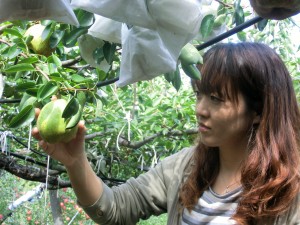 秋晴れの中で、ラフランスの収穫を体験しおいしいソーセージ